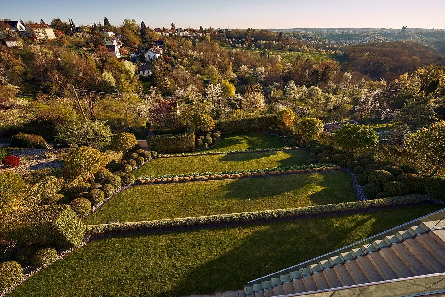 Die Gartenlandschaft ist mediterran inspiriert und fügt sich in ihren geradlinigen Formen perfekt in den Stil des Hauses – das Grün öffnet sich soweit das Auge reicht.